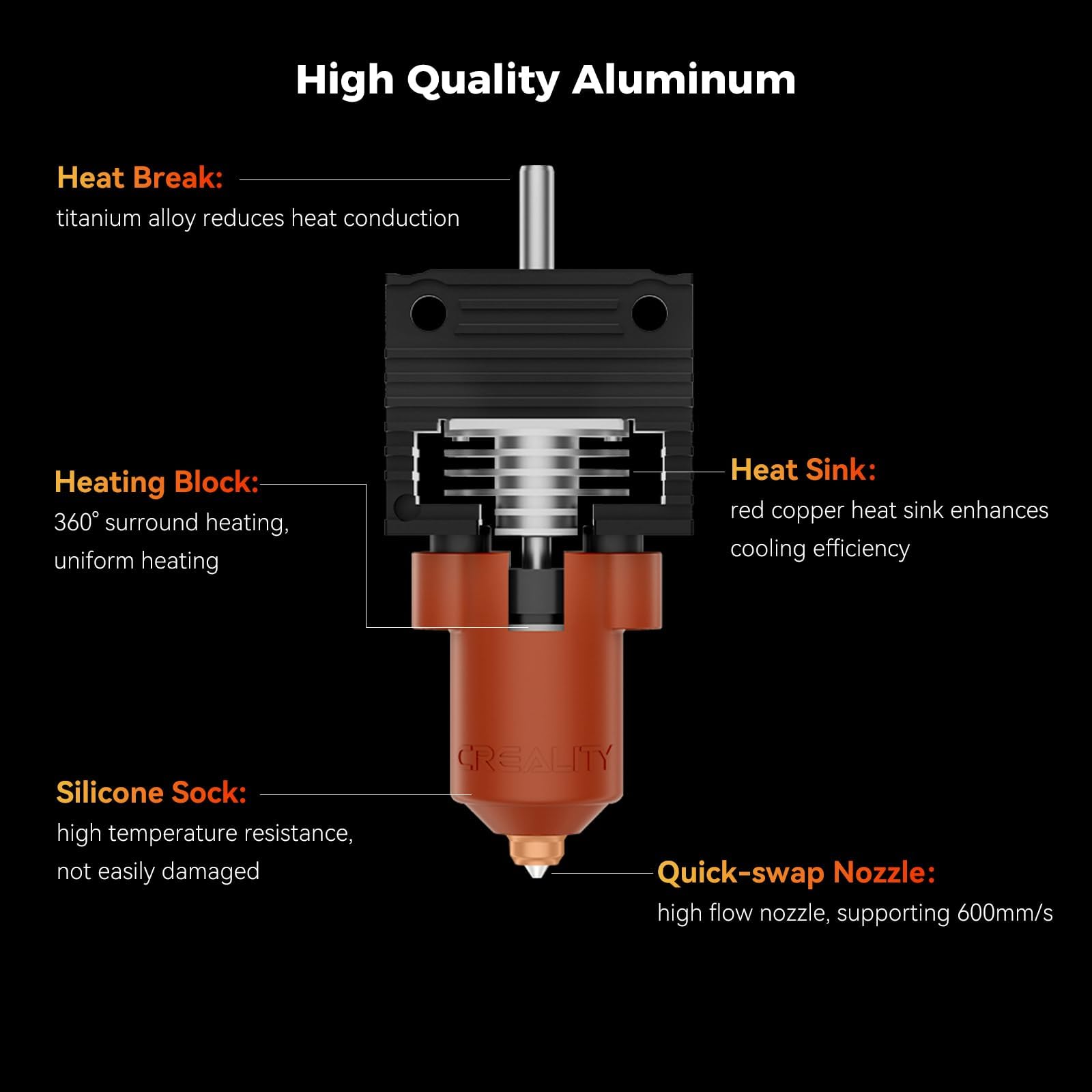 The nozzle chamber’s been enlarged, supporting a max flow rate of 32 mm³/s. That means you can print at 600 mm/s—a big jump from the usual speeds.