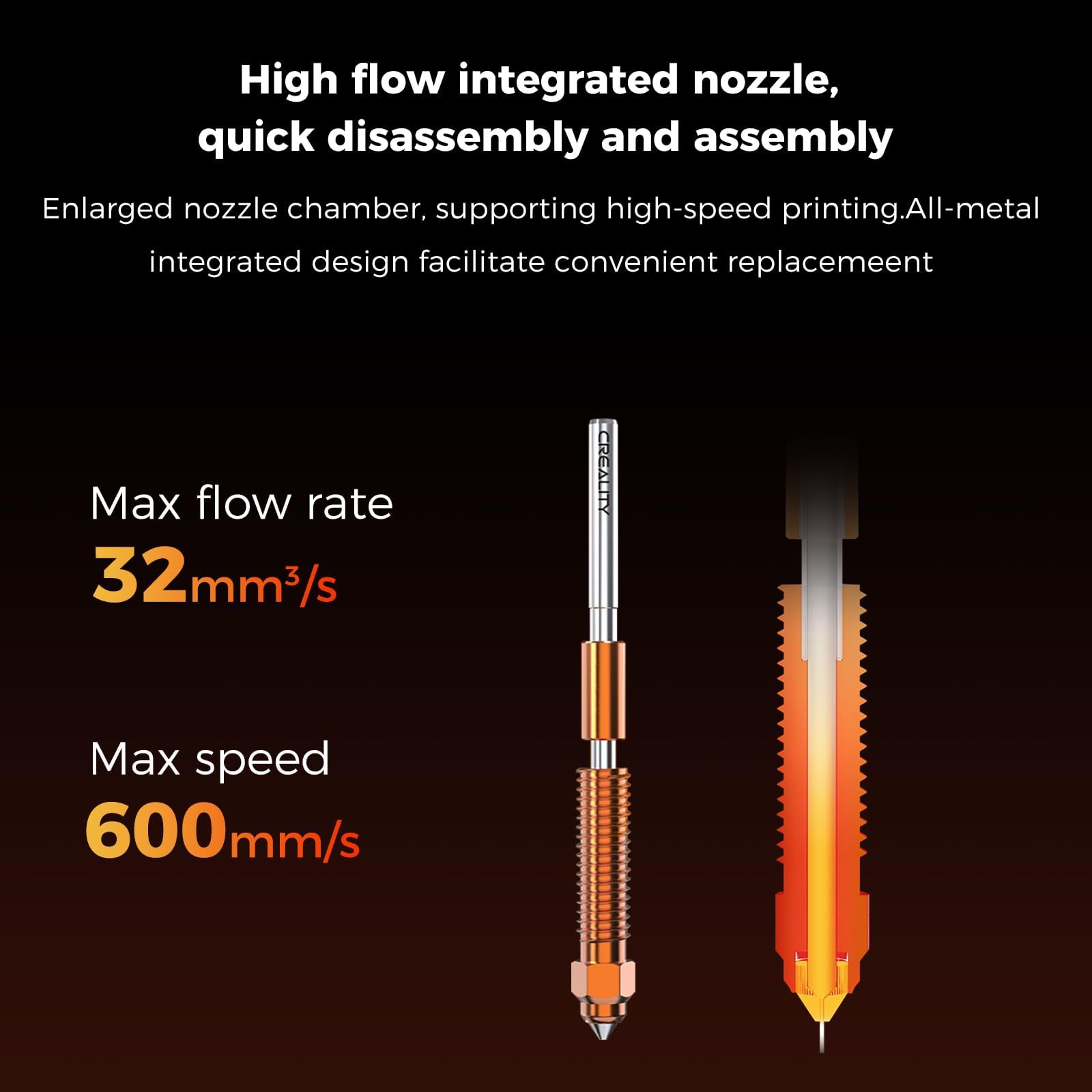 The enlarged nozzle chamber achieves a maximum flow rate of 32 mm³/s, allowing for high-speed printing at 600 mm/s.