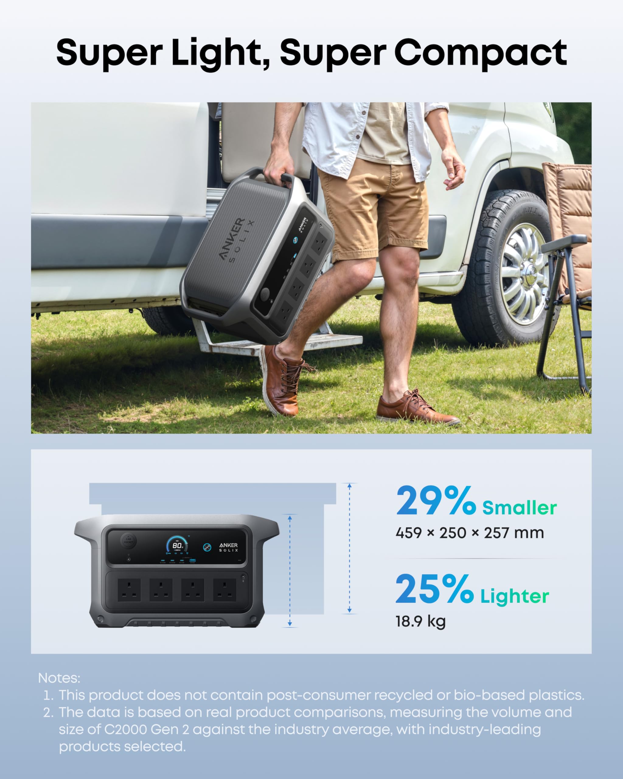 When you open up the Anker SOLIX C2000 Gen 2, the compact design is the first thing you notice. At just 18.9 kg and measuring 460 × 249 × 257 mm, it’s 25% lighter and 29% smaller than other 2kWh power stations.