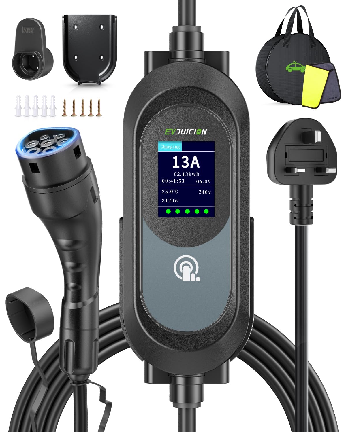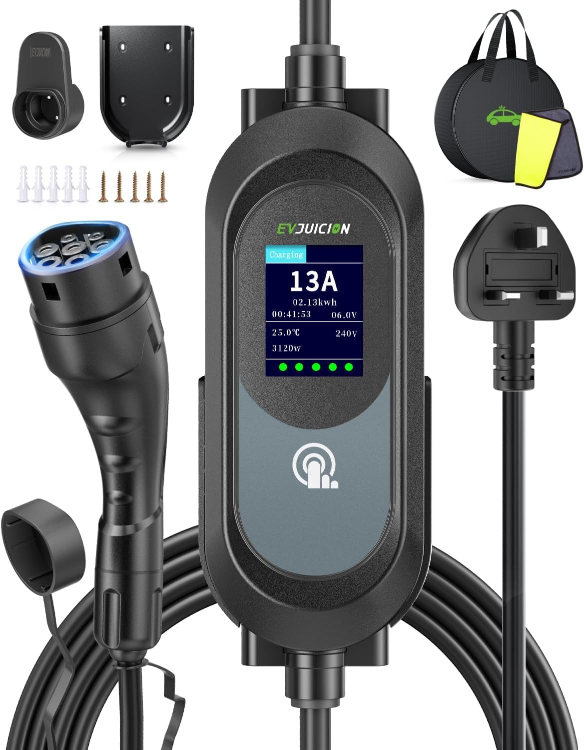 EVJUICION EV Charger 3 Pin Plug, 6M 3.1kW 6-13A 3 Pin EV Charger, Portable Electric Car Charger for up to 12H Delayed Start Charging with 2.4″ LED Screen, IP67 for EVs & PHEV