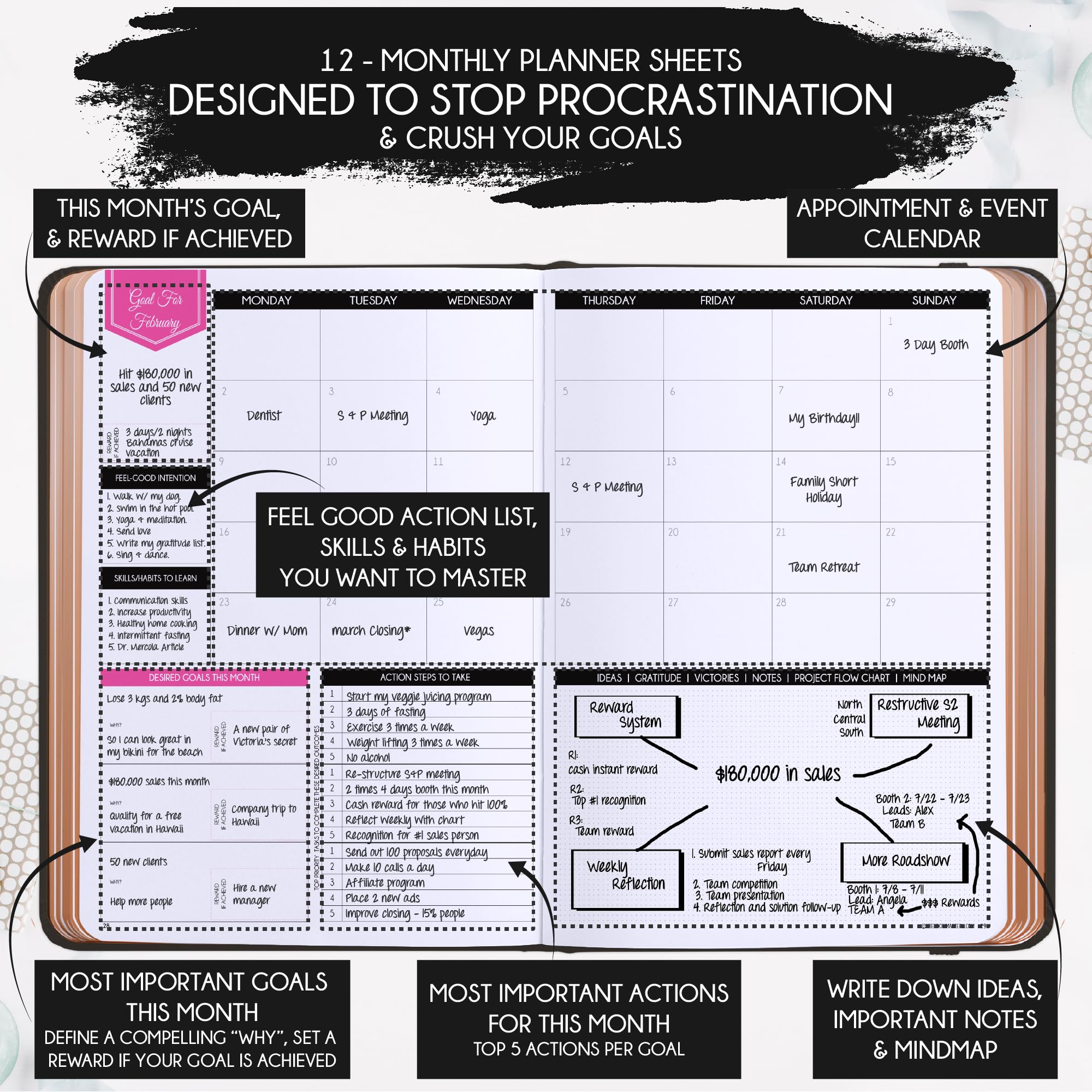 The standout feature of this planner is its unique weekly and daily productivity system. This system encourages users to not just plan their days but also to reflect on their achievements and challenges. The 8-step planning process is particularly beneficial for those struggling with procrastination, as it provides structured guidance to help bring balance into daily life. The planner promotes focus and happiness, which are essential for anyone looking to elevate their productivity.