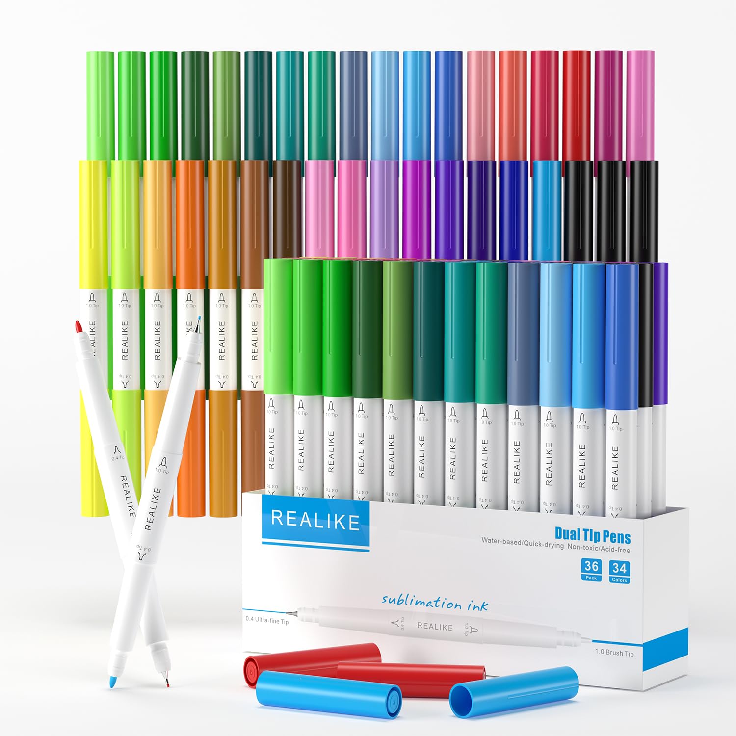 First impressions of the REALIKE markers are quite positive. The packaging is neatly organized, and the vibrant array of 34 colors (with two black pens included) is impressive. The dual tips, featuring a 1.0 mm coloring tip and a 0.4 mm fine point tip, cater to different project needs, making them versatile for both broad strokes and detailed designs. For the best results, the manufacturer recommends using a heat press machine set to 400°F (205°C) for transferring designs onto sublimation blanks.