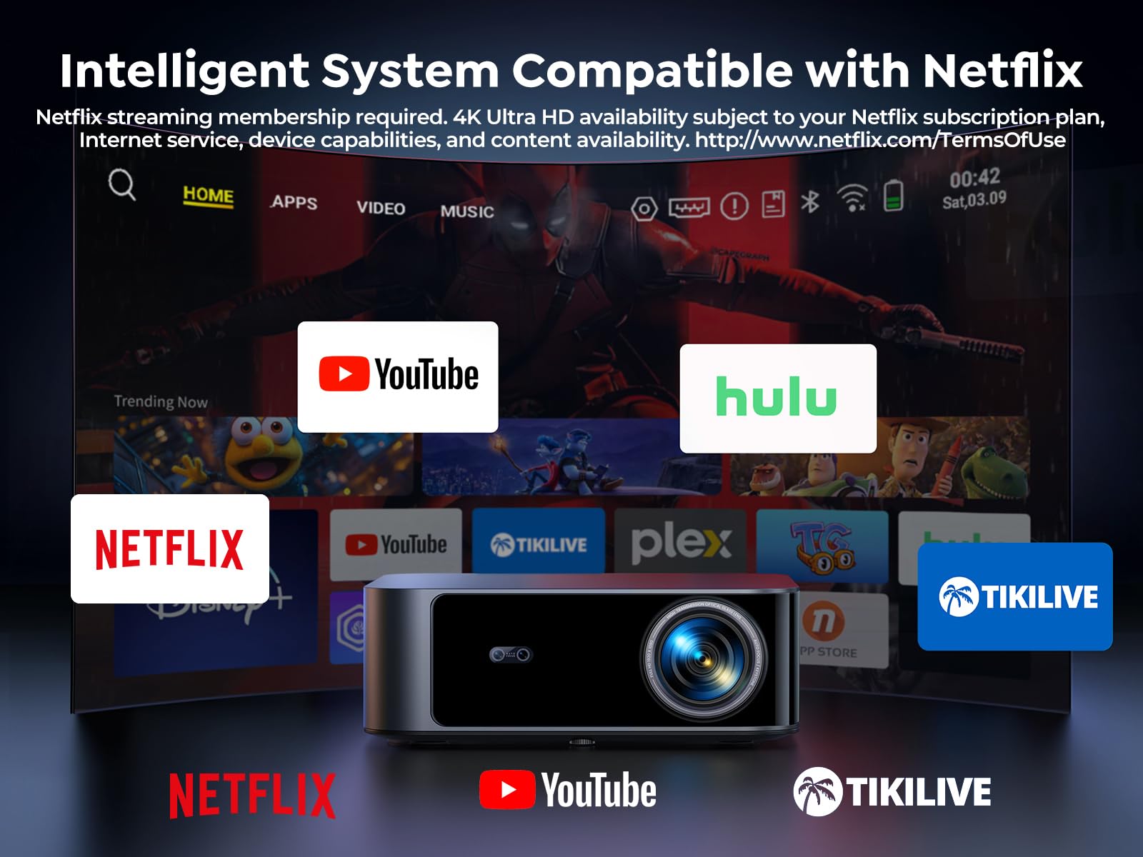 NetfIix Officially & DoIby Audio,AURZEN 4K Supported Smart Projector with Auto Focus & Keystone, 500 ANSI, HDR 10 60Hz WiFi Bluetooth Outdoor Projector for Smartphone/USB/HDMI/USB